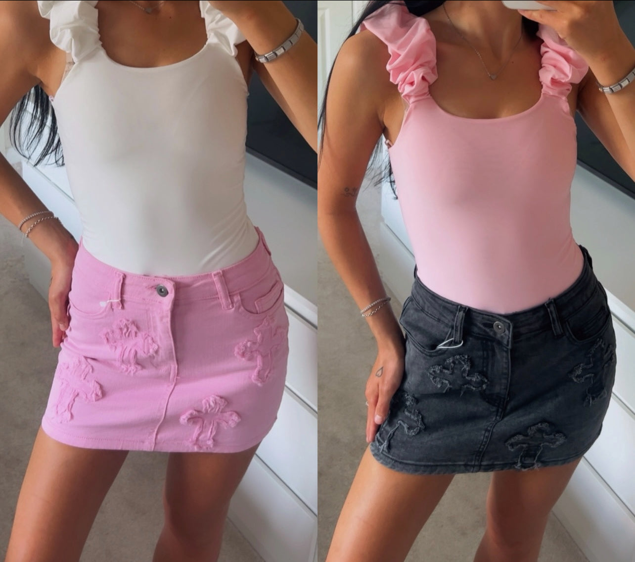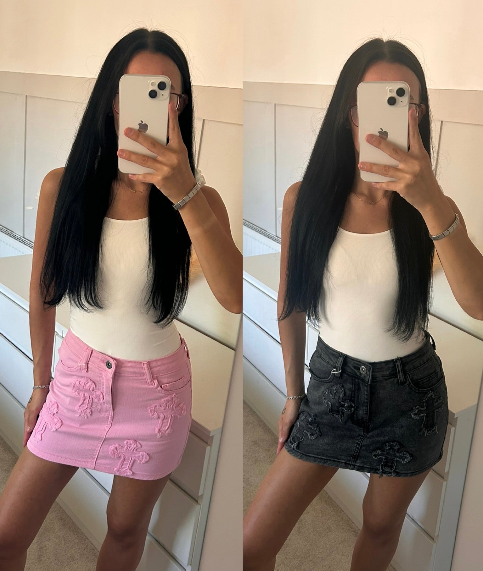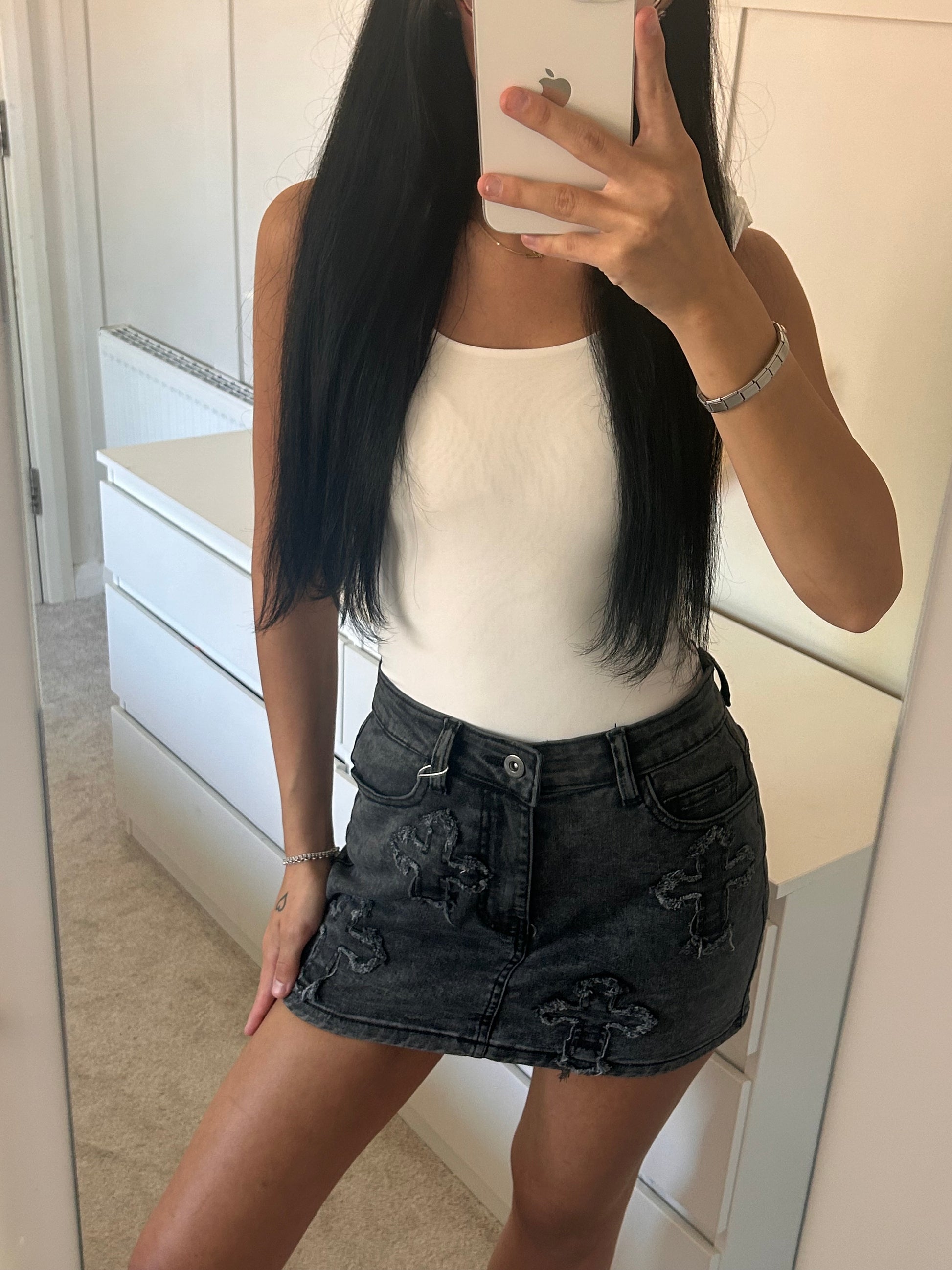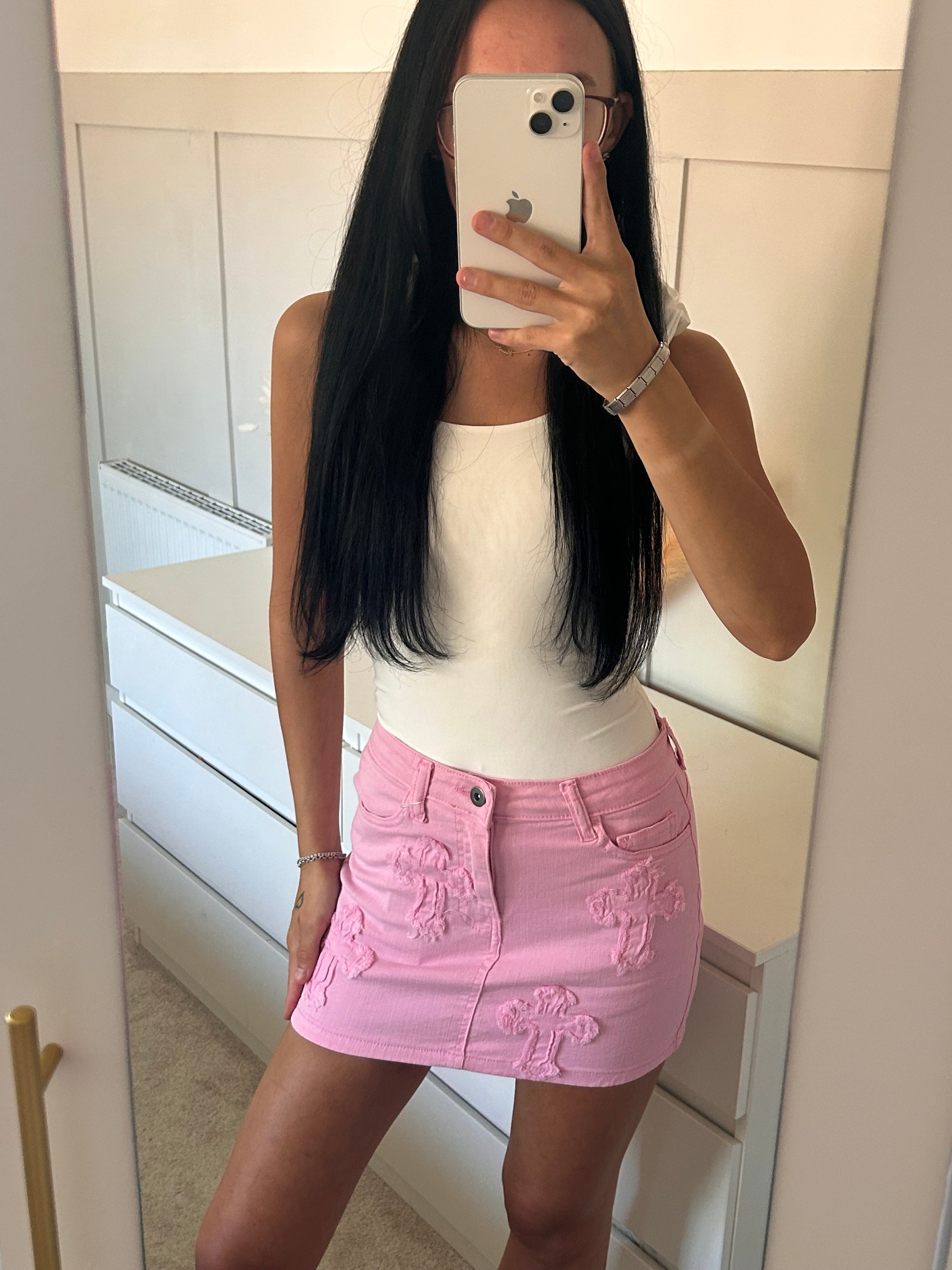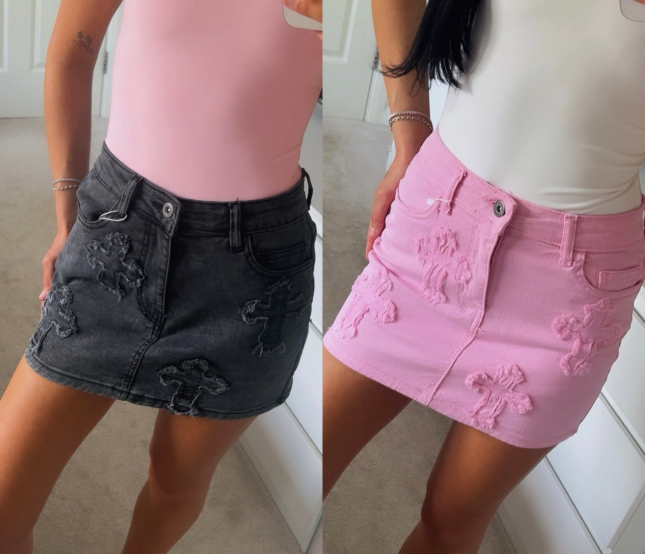 This denim mini skirt features intricate crucifix embroidery and convenient side and back pockets. With a length of 12 inches and a blend of 98% cotton and 2% elastane, this skirt combines style and comfort. Perfect for any occasion, the belt loops add versatility to this must-have piece.
