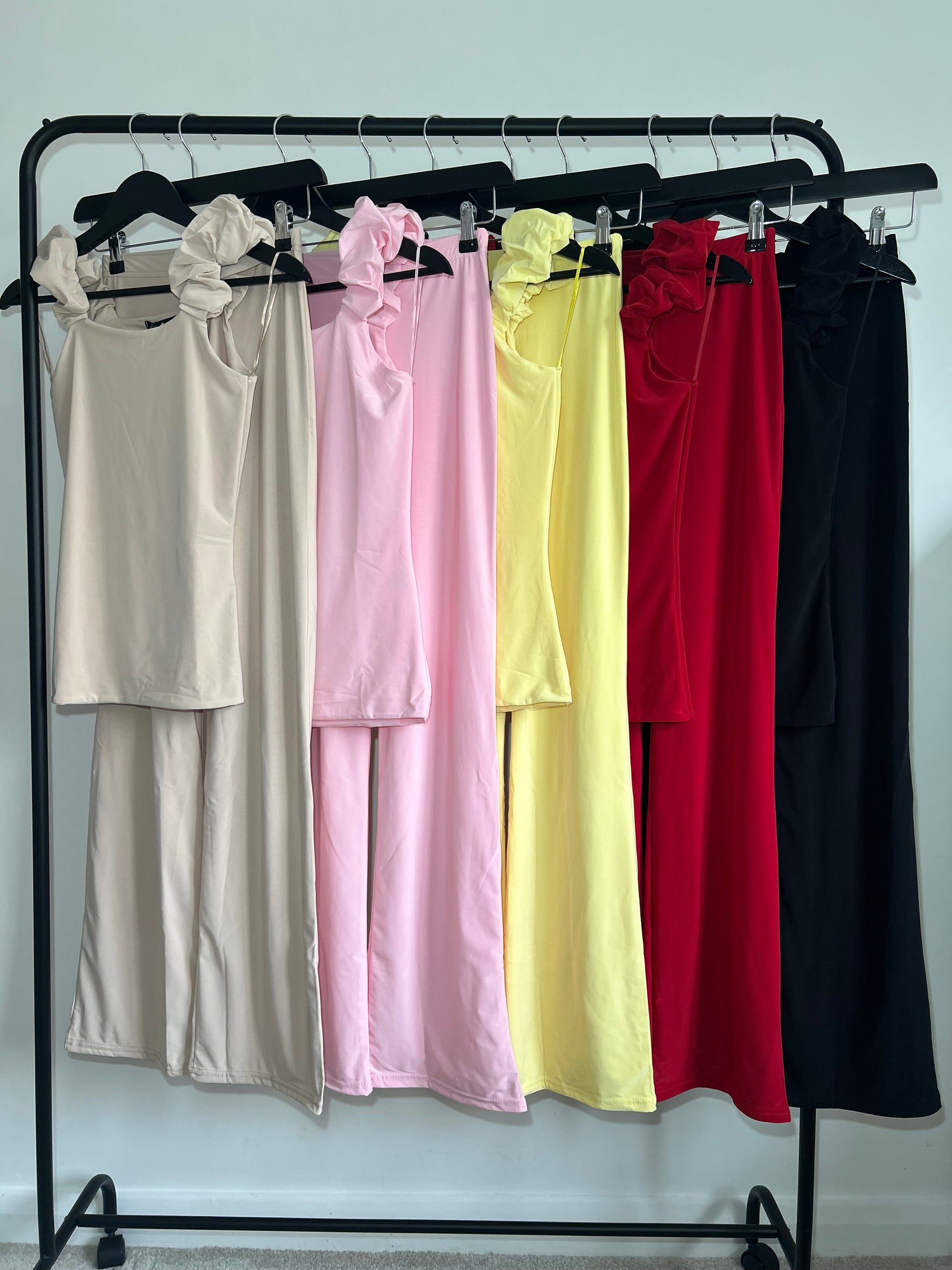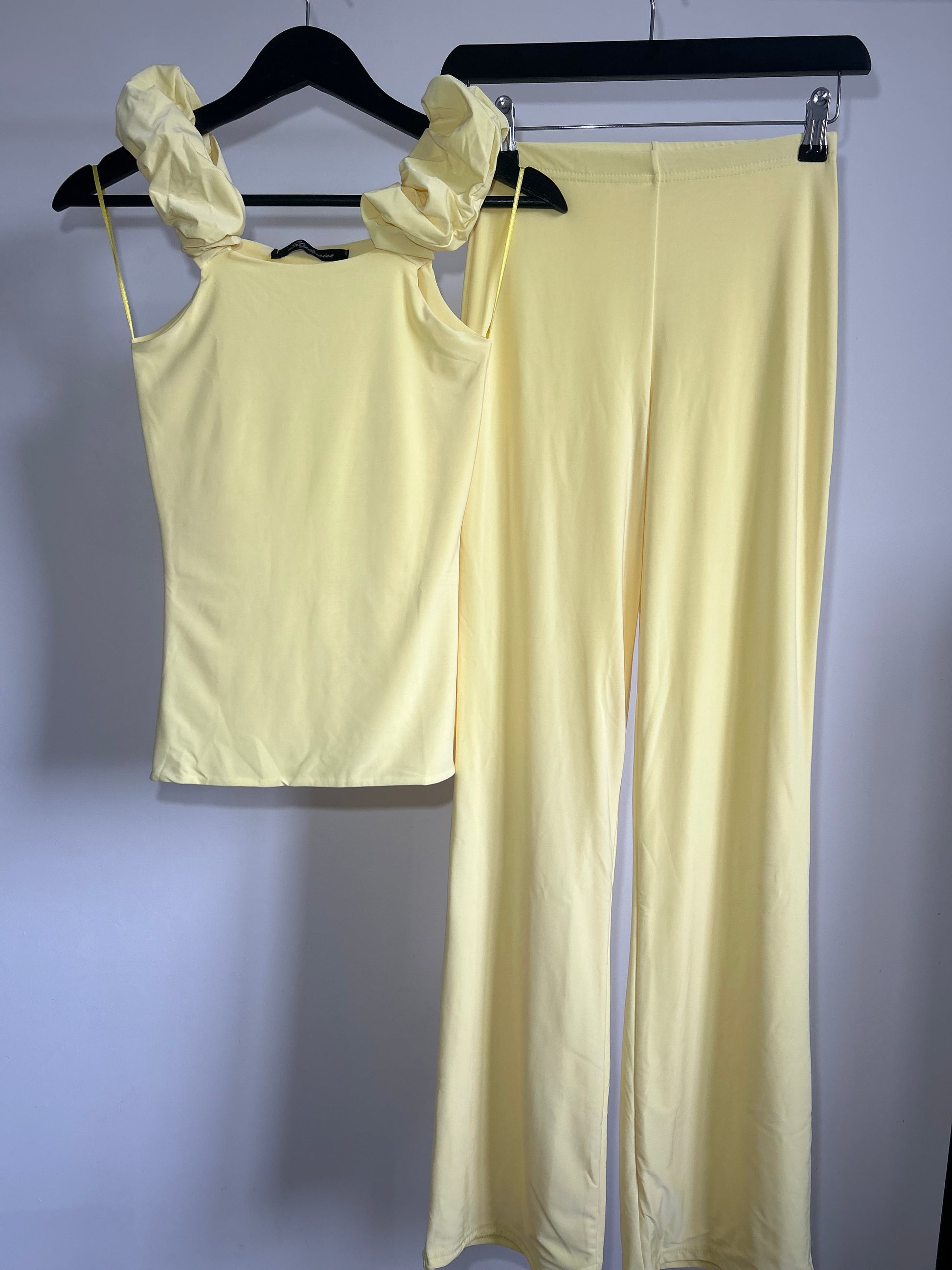 Sport a stylish and comfortable look with our Frill Sleeve Flared Slinky Co-Ord. Made with double lined slinky material, this set is super soft and stretchy for all-day wear. The perfect combination of fashion and function, this co-ord is a must-have in your wardrobe!