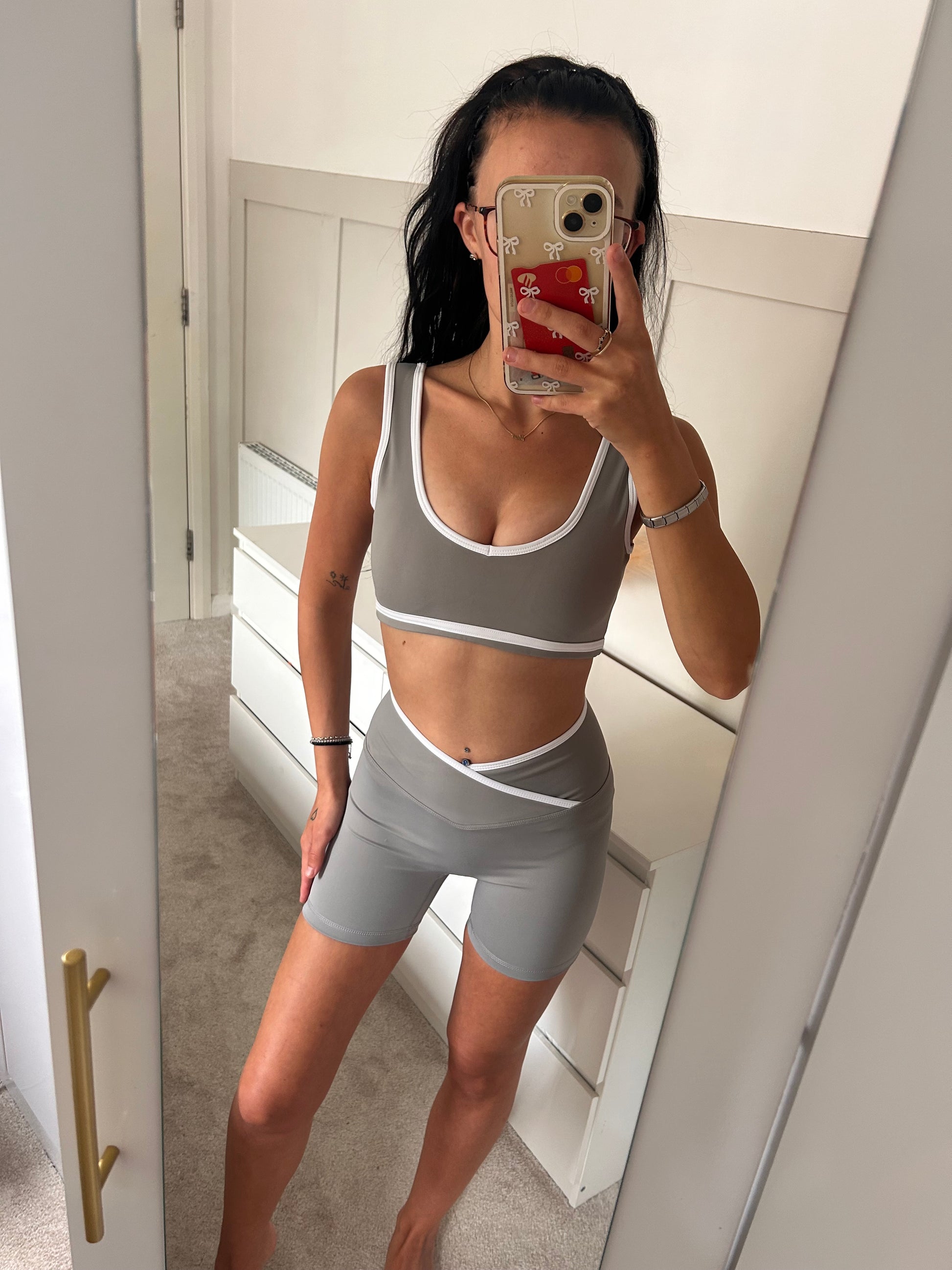 Introducing our PIPING EDGE PADDED SHORTS GYM SET, designed with a cropped top, piping detail, and cross over front for a comfortable and stylish workout. Made with 80% polyamide and 20% elastane, choose from Grey, Khaki, or Plum. Experience the perfect combination of fashion and function in one set.